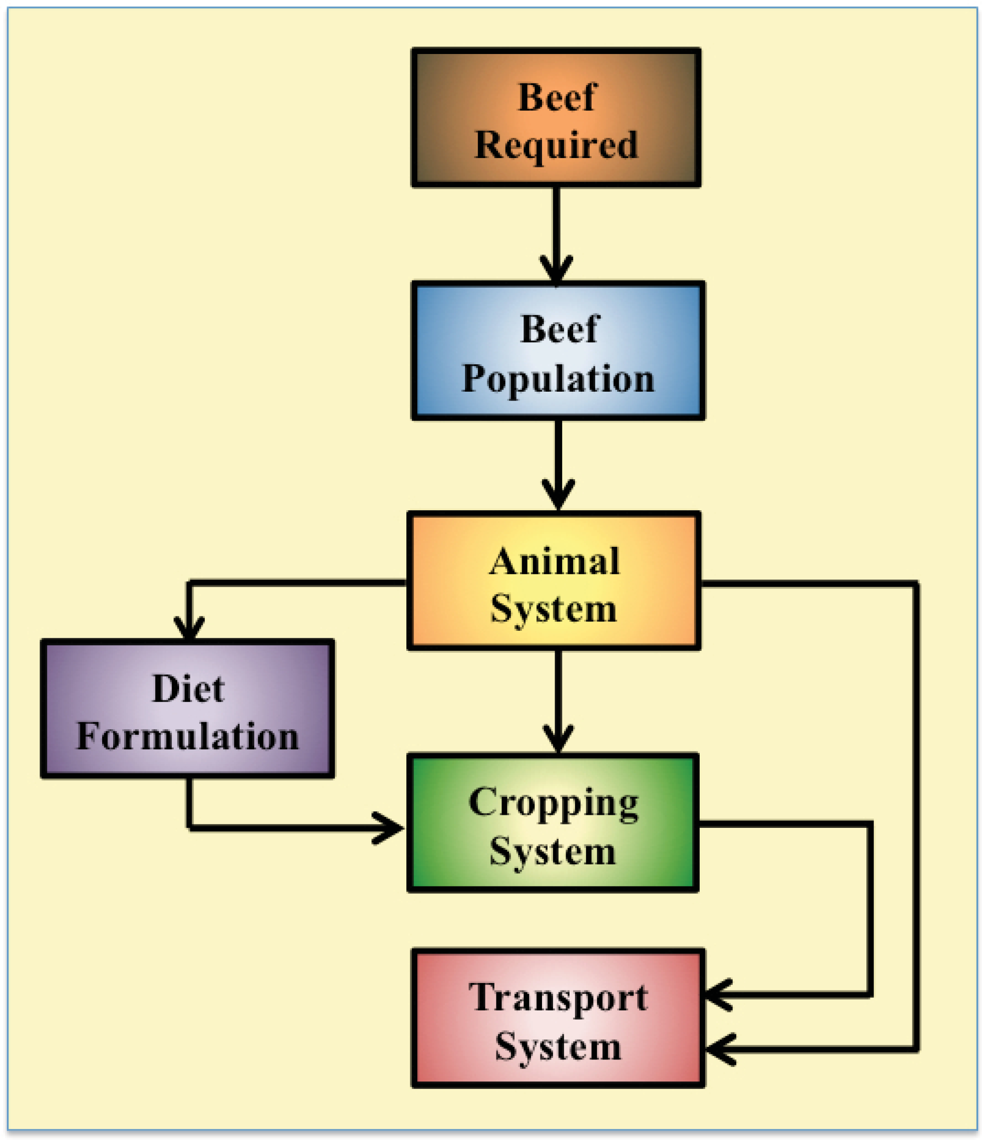 A deterministic EIM of beef production was created within Microsoft Excel. The EIM contained four different sub-models: the beef population, the animal system, the cropping system and the transportation system (Figure 1).