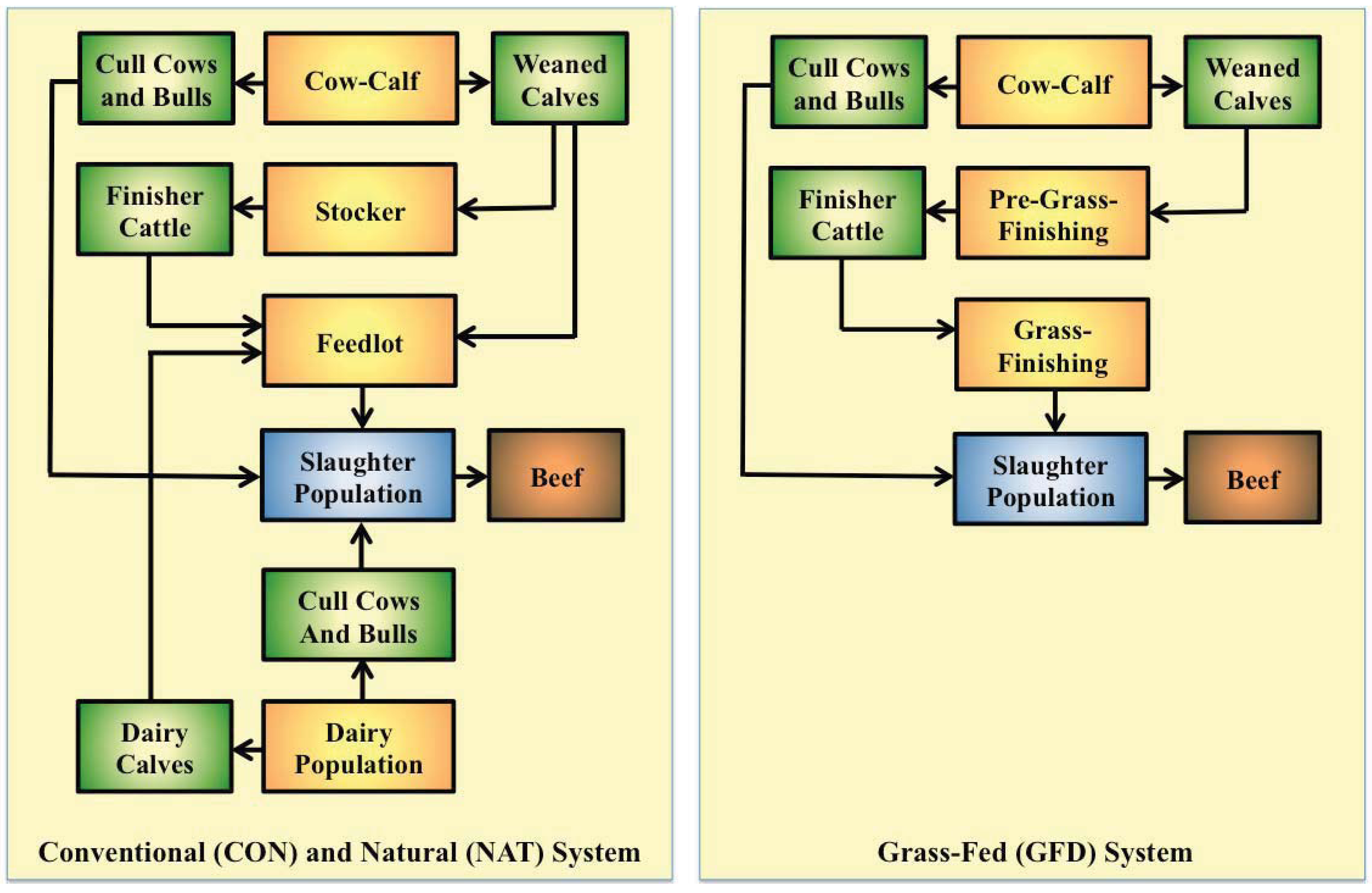 The ASSM contained six sub-systems. The cow-calf unit contained beef breed animals (Angus cows, Hereford bulls and Angus × Hereford offspring) that served to support population dynamics (lactating and dry cows, pre-weaned calves, replacement heifers, adolescent bulls, yearling bulls and mature bulls). The stocker operation and pre-grass-finishing system contained weaned beef breed steers and heifers fed until they reached sufficient weight to be placed into the feedlot or the grass-finishing system. The feedlot contained calf-fed beef and dairy (Holstein) animals that enter the feedlot at weaning (beef calves) or four months of age (dairy calves); and yearling-fed beef breed animals that enter the feedlot after the stocker stage. Within the feedlot, cattle were fed until the desired weight and condition were achieved. A dairy system was also contained within the CON and NAT systems for the purposes of supplying dairy-bred calves and cull dairy cows and for consequent allocation of resources and emissions between the beef and dairy system. The grass-finishing system contained beef breed steers and heifers fed until the desired weight and condition was achieved.
