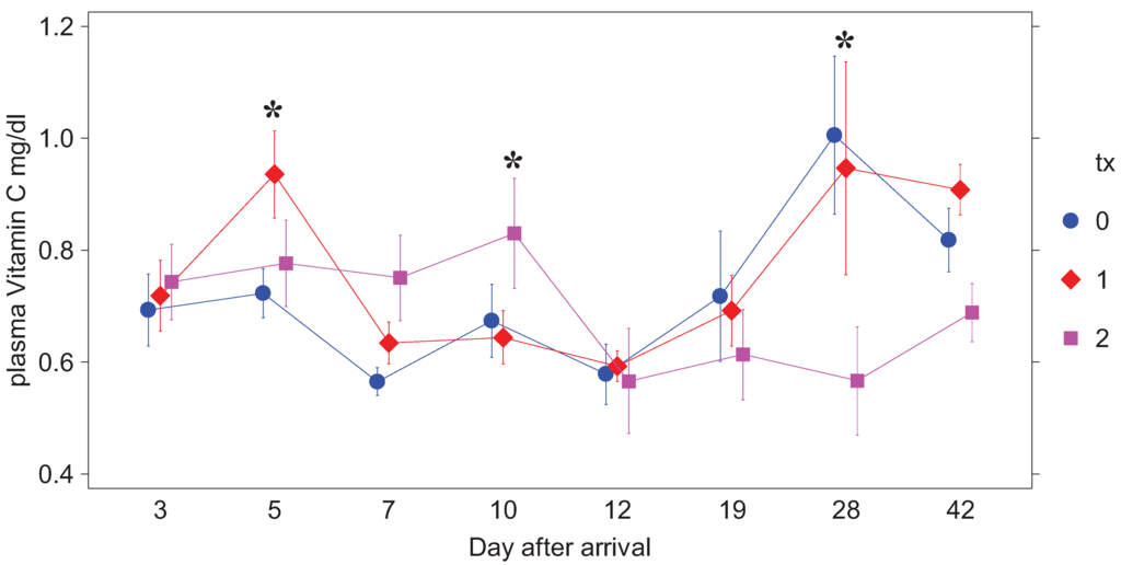 Ascorbic acid supplementation tended to increase plasma AA concentrations relative to unsupplemented weanlings following prolonged transport, though the increases were not statistically significant. There have been similar observations of response to supplementation in horses affected with recurrent airway obstruction [], in race training [] and during and after a 140 km endurance race []. Loscher et al. [] stated that plasma AA concentration showed no significant increase when administered orally to unstressed horses, and it is presumed that AA in excess of need is excreted in the urine []. On the other hand, Snow et al. [] found that repeated oral administration of AA to horses in strenuous training (stress condition) resulted in significant increases in plasma AA. The lack of clear significance in this study could have been due to variability in the weanlings’ responses to handling and training, which due to the relatively small sample size (n = 4 for each tx) may have obscured differences Supplementation of AA before transportation would be of no benefit since it would presumably be merely excreted. Short term stressors (<12 hours) can actually cause an increase in plasma AA as it is released from body stores in the adrenal gland (and ovaries in females) [,]. However prolonged stresses do decrease plasma AA [,,,,,,] and supplementation of AA to horses undergoing severe stress (transportation, competition, chronic illness) for over 12 hours may benefit from supplementation.