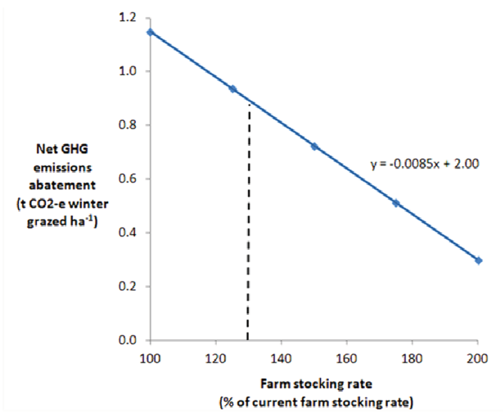 Effects of different changes to stocking rate coinciding with the establishment of Kikuyu on 45% of arable farm land are reported in Figure 1. This figure indicates that establishing Kikuyu pasture is likely to have a positive GHG emissions abatement value even if the farm stocking rate is doubled (at double normal stocking rate the net abatement value would be 0.30 t CO2-e pasture ha−1 yr−1), although this scenario is not expected because the business is likely to become less profitable. The model predicts that the value of establishing Kikuyu at the proposed level as a carbon offset would be reduced by 0.085 t CO2-e pasture ha−1 yr−1 for every 10% increase in farm stock numbers (Figure 1).