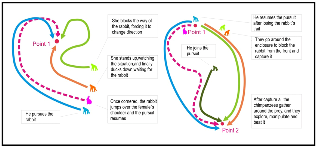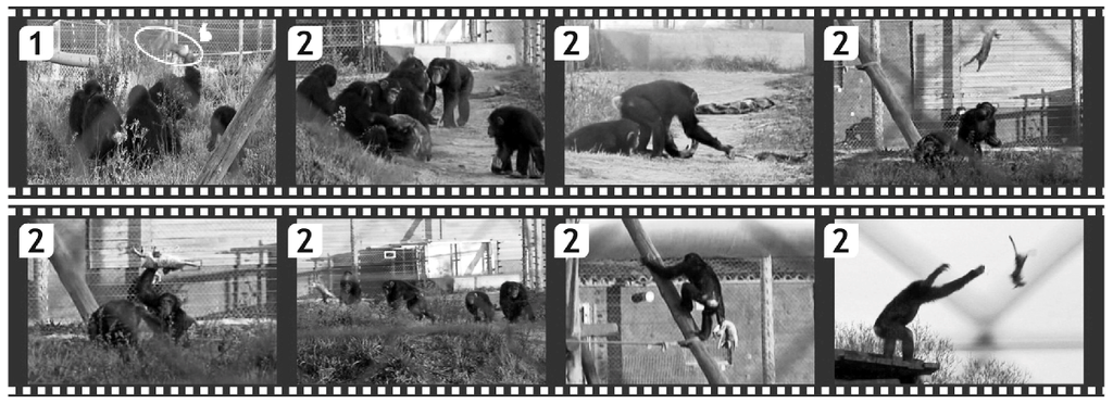 This episode was recorded on 19 January 2007. It started at 17:10. Four chimpanzees took an active part in the predation: two juvenile females, one young male and one juvenile male (Figure 1). A rabbit (Oryctolagus cuniculus) came into the enclosure by chance. It was finally captured by the four chimpanzees after two attempts in which the hunters took on different roles in the action. The first attempt was made by three chimpanzees (one juvenile male and two juvenile females). The male (Bongo) pursued the prey while the females (Sara and Waty) positioned themselves for an ambush to block the rabbit’s escape route and to capture the animal (Figure 1). The second attempt was performed by all four chimpanzees (one young male, one juvenile male and two juvenile females). One of them (Juanito) performed the role of pursuer while the others (Waty, Sara and Bongo) set up an ambush in a semicircular position, blocking and capturing the prey. Once the hunting episode was finished, the other three chimpanzees joined the group: one adult female (Romie), one adult male (Toto) and one young male (Nico). All the individuals gathered around the rabbit, which was taken by its hind legs by the oldest chimpanzee (Toto) and beaten once against the ground with one fatal blow. Immediately, a sequence of exploration and brutal play behaviors started among the five juvenile and young individuals (Figure 2). The prey was not consumed, although some individuals tried to bite it.