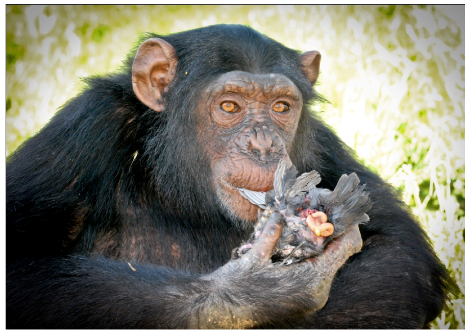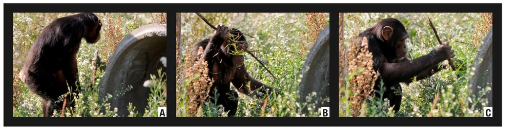 Hunting is relatively wide spread among many wild primates. Predation is mainly specific to arthropods and small vertebrates [1,2]. Predatory behavior in wild chimpanzees has been well documented over the last 30 years [3,4,5,6,7]. Studies have shown that it is a systematic behavior in different populations of chimpanzees [8], which may occur either individually or cooperatively. Cooperative hunting has social implications since it helps to maintain and reinforce social relationships among the individuals of a group. The most commonly hunted prey is red colobus (Procolobus sp.) at all long-term study sites: Gombe [9], Mahale [10], Ngogo [11], and Taï [12], among others. However, hunting episodes of small prey are also well documented [13]. Moreover, other primate species can be hunted by chimpanzees: Galago senegalensis [14], Papio cynocephalus [15], or Erythrocebus patas [16], among others. Furthermore, some authors have observed chimpanzees using tools in attempts to extract, capture and kill prey [17,18].