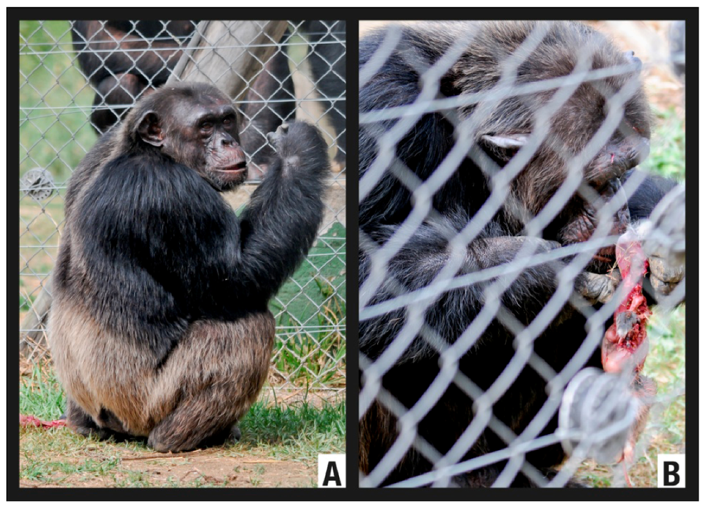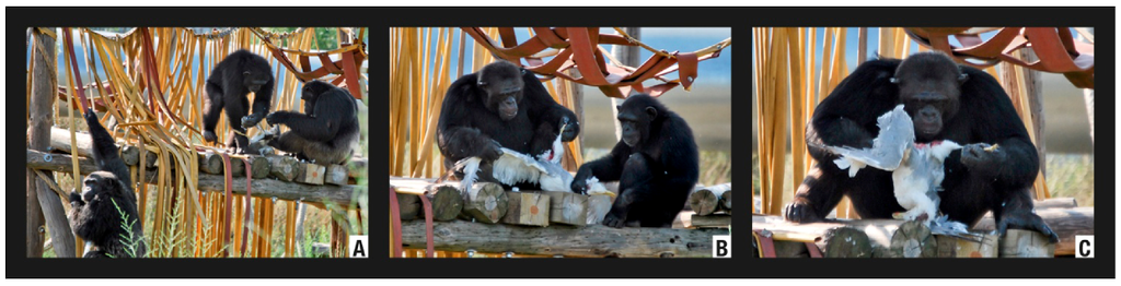 Predation on fast-moving animals (i.e., rabbits) or large birds (i.e., seagulls) has not been documented in captive chimpanzees despite several decades of observation of these animals in captive and naturalistic settings. The only report about hunting behavior in captive chimpanzees was published by Videan and colleagues several years ago [21]. Even rehabilitated animals and non-experienced subjects, when given the opportunity will hunt and occasionally partially consume prey items. Although wild chimpanzees rarely capture an animal without eating it, in both the wild and in captivity, some individuals (such as at FM) hunt but do not eat prey [28]. Once they have killed, some wild chimpanzees prefer to play with rather than consume their prey [29] as we reported in all five episodes at Mona. Wild bonobos (Pan paniscus) also showed similar exploration and grooming following their capture of infant monkeys which were handled and manipulated like dolls [30]. At FM the prey was not eaten entirely but partially consumed [14]. According to the roles, juveniles and adolescent individuals showed more interest in the prey, although some adult subjects participated in the hunting events as well. In wild settings the active role of males during the “hunting but not eating” episodes was not found [28]. In the case of bird predation we found some similarities between FM and wild chimpanzees. In Bossou [28] and in Mahale [31] the catching of birds is mainly solitary and opportunistic, not requiring social hunting, and the performance and strategy tend to be repeated in subsequent occasions. From our point of view, the present findings shed light on the behavioral recovery and diversity of rehabilitated chimpanzees and on the ability of these animals to develop species-typical behaviors in these types of naturalistic enclosures, although unusual in that they did not eat much of the meat. Furthermore, we hypothesize that predation could be a form of boredom alleviation despite the extensive methods of environmental enrichment engaged by Fundació Mona [27,32,33,34,35]. In fact, although with a decreasing trend, inactivity is the most frequent behavior in the study sample [36].
