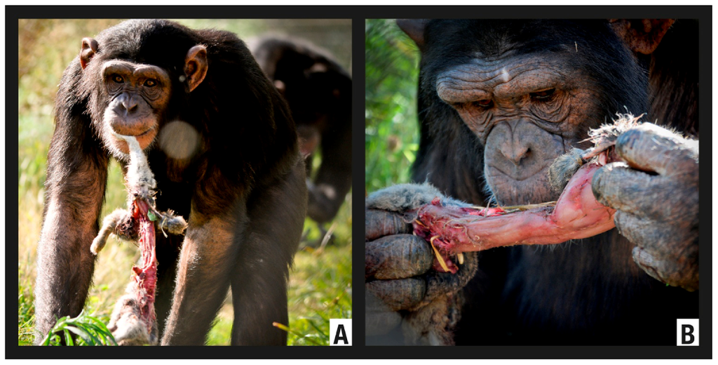- Videan, E.N.; Fritz, J.; Murphy, J. Hunting and occasional consumption of prey items by chimpanzees at the Primate Foundation of Arizona. Int. J. Primatol. 2007, 28, 477–481. [Google Scholar] [CrossRef]