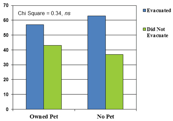 Owning a pet did not emerge as a statistically significant risk factor for failing to evacuate prior to Hurricane Irene in this sample. Of the pet owners in our sample, 51 (57%) evacuated and 39 (43%) did not evacuate. Of the non-pet-owners in our sample, 17 (63%) evacuated and 10 (37%) did not evacuate (χ² = 0.34, ns). See Figure 1. Owning a pet other than a dog or cat was also unrelated to evacuation choices (χ² = 1.2, ns).