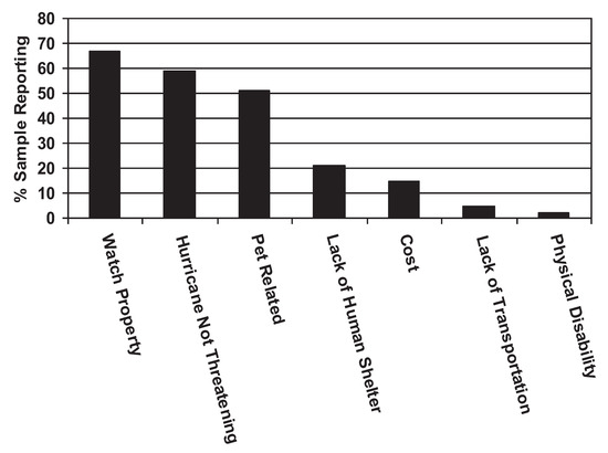 While owning a pet was not a statistically significant risk factor for evacuation failure in our sample, twenty pet owners (51%) who failed to evacuate endorsed pet-related factors as influencing their evacuation decisions to a great degree. These factors included things like inability to transport pet, cost of transporting or sheltering pet, and lack of a place for the pet to stay. Twenty-six pet owners who did not evacuate said that wanting to watch their property was the single most important factor in their decision to not evacuate. Twenty-three pet owners said they felt the hurricane was nonthreatening. Other primary reasons for not evacuating among pet owners included lack of shelter for people (8 people), cost of evacuating (6 people), physical disability (2 people), and lack of transportation (1 person). See Figure 2.