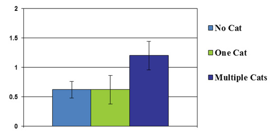 Owning a dog, the number and size of dogs in a household, and owning a cat were not associated with failing to evacuate or difficulty evacuating. The number of cats owned, however, was associated with increased difficulty evacuating. Actual number of cats owned was highly correlated with evacuation difficulty (r = 0.61, p < 0.001). Moreover, individuals who owned multiple (2 or more) cats rated evacuating as significantly more difficult than individuals with no cats, or only 1 cat (F(2,41) = 16.01, p < 0.001). See Figure 3.