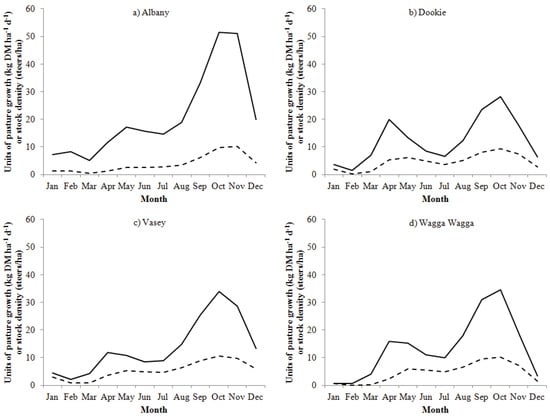Predicted average daily pasture growth (─; kg DM ha−1 d−1) and stock density (- -; steers/ha) from January to December for the years of 1971 to 2000 at (a) Albany, (b) Dookie, (c) Vasey and (d) Wagga Wagga.