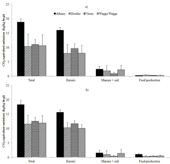 The average annual CO2-eq. emissions/ha were 1.1 ± 0.1 t CO2-eq. at Albany, 0.6 ± 0.4 and 0.9 ± 0.2 t CO2-eq. at Dookie, 0.7 ± 0.2 and 1.1 ± 0.1 t CO2-eq. at Vasey, and 0.7 ± 0.3 and 1.0 ± 0.2 t CO2-eq. at Wagga Wagga (Table 3) on pasture or pasture with supplementary feed, respectively. Notably, the CO2-eq. emissions/ha increased with supplementary feed being given at Dookie, Vasey and Wagga Wagga as the average live weight of a calf at weaning increased (Table 2).