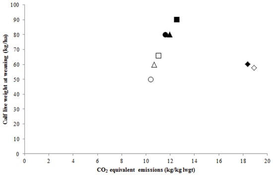 Predicted average annual carbon dioxide (kg CO2-eq.) equivalent emissions per kg calf live weight at weaning (kg lwgt) and turnoff of calf live weight at weaning (kg) per hectare at Albany (diamond), Dookie (circle), Vasey (square) and Wagga Wagga (triangle) for the years 1971 to 2000 for cows on pasture (white symbols) or pasture and supplementary feed (black symbols).