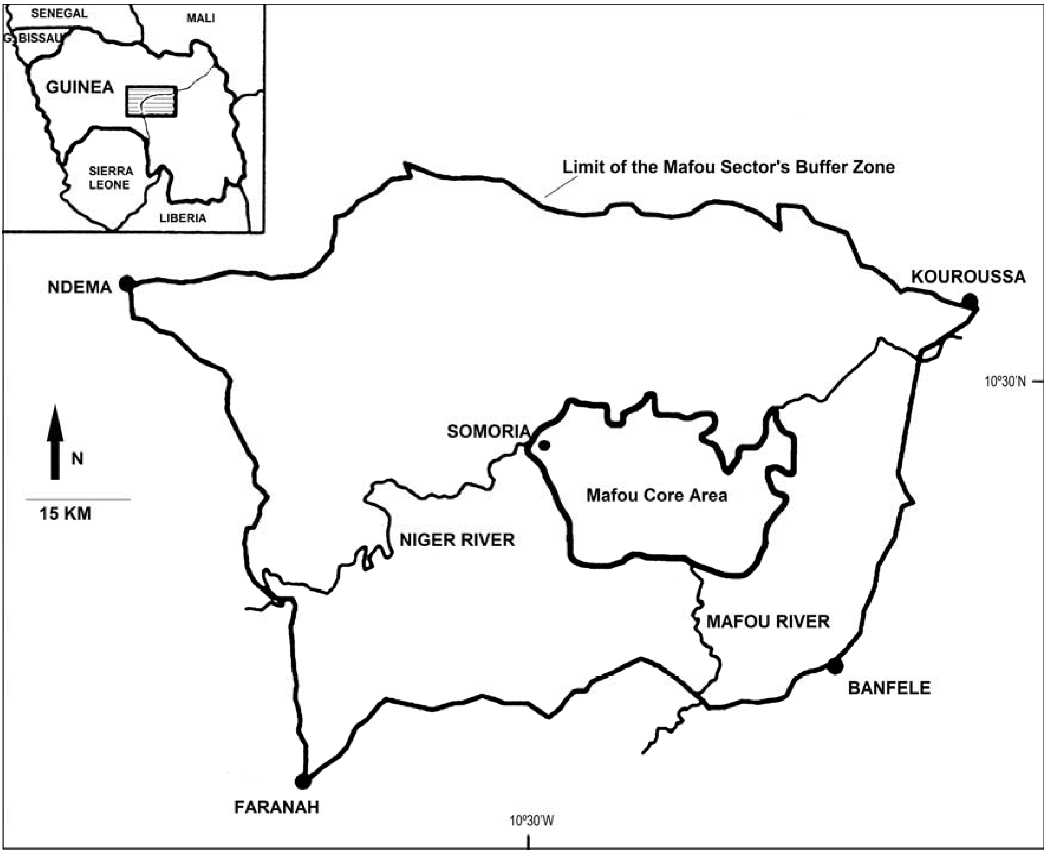 Map of the location of the Haut Niger National Park (HNNP) in Guinea, West Africa, highlighting the Mafou core area of the park and the relative location of the sanctuary in Somoria (adapted from [33]).