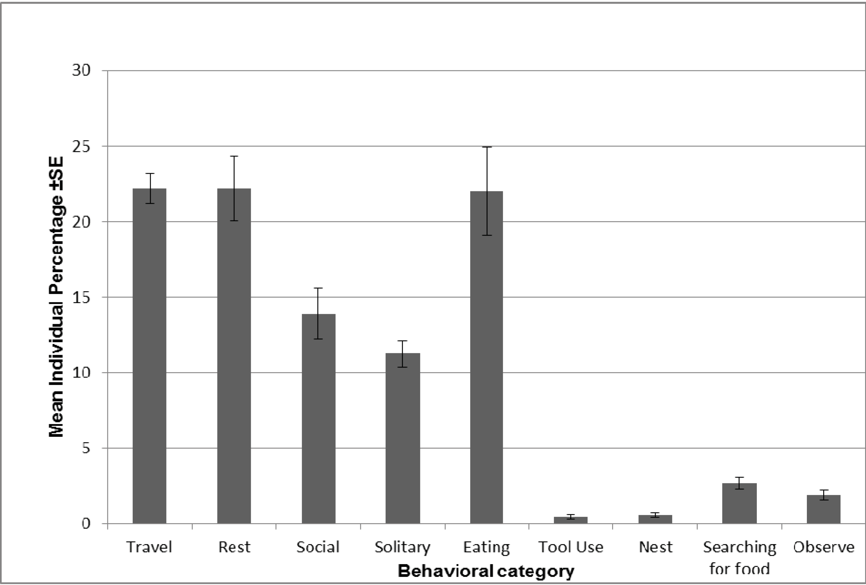 Mean individual percentage of time spent (±1 SE) across the nine main behavioral categories recorded during continuous focal follows.