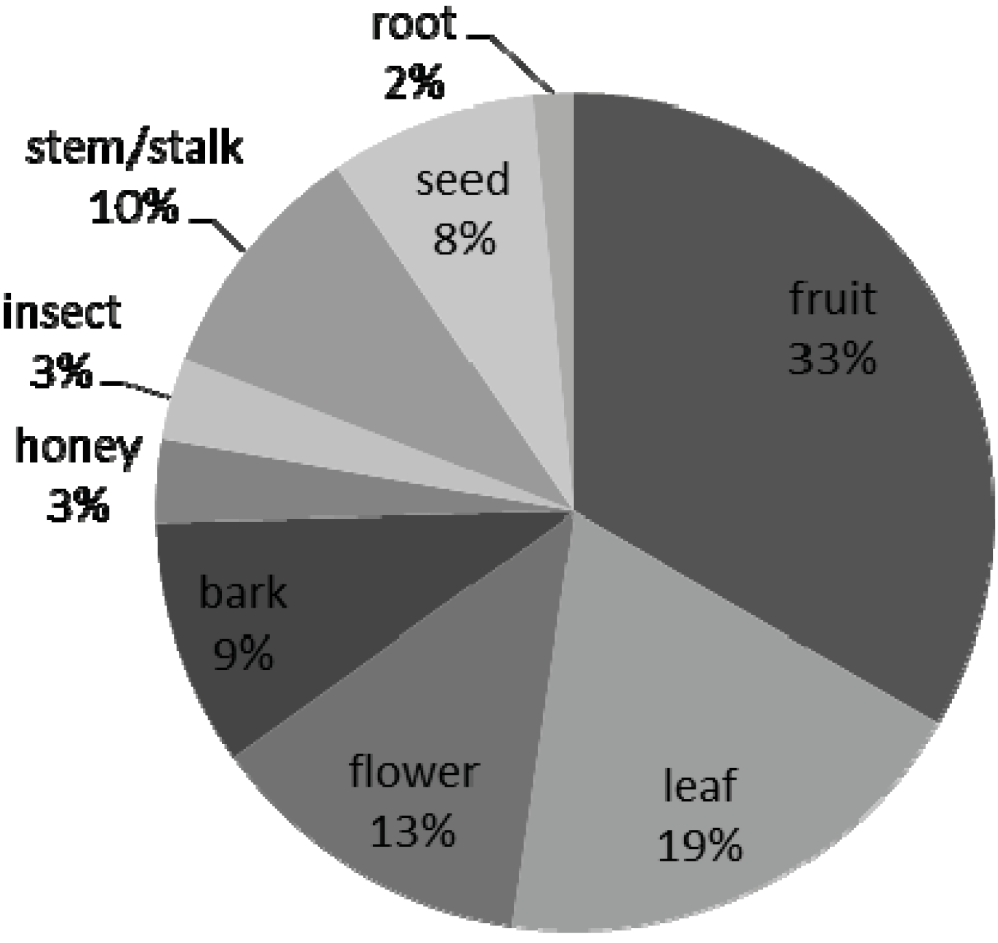 Percentage of food parts consumed (n = 63) during bush-outings during the four-month study period.