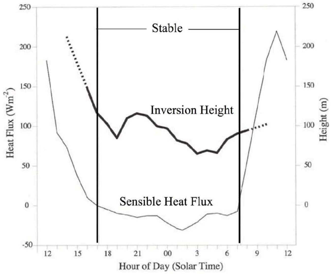 Savannah measurements of heat flux and inversion height. Sensible heat flux and inversion height over 24 hours over an open subtropical savanna. Mean values are shown from observations taken by a flux tower, vertical pointing, continuously operating SODAR and a profiling tethered balloon. The heavy line indicates a clearly defined inversion top, with dashes indicating disappearance of an inversion. The dashed line shows sensible heat flux (left ordinate) with the vertical lines delineating the stable region of negative heat flux at the surface [