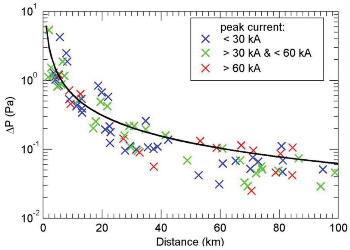 7]. At 100 km from a thunderstorm, they report the sound pressure to be 6 (±4) × 10