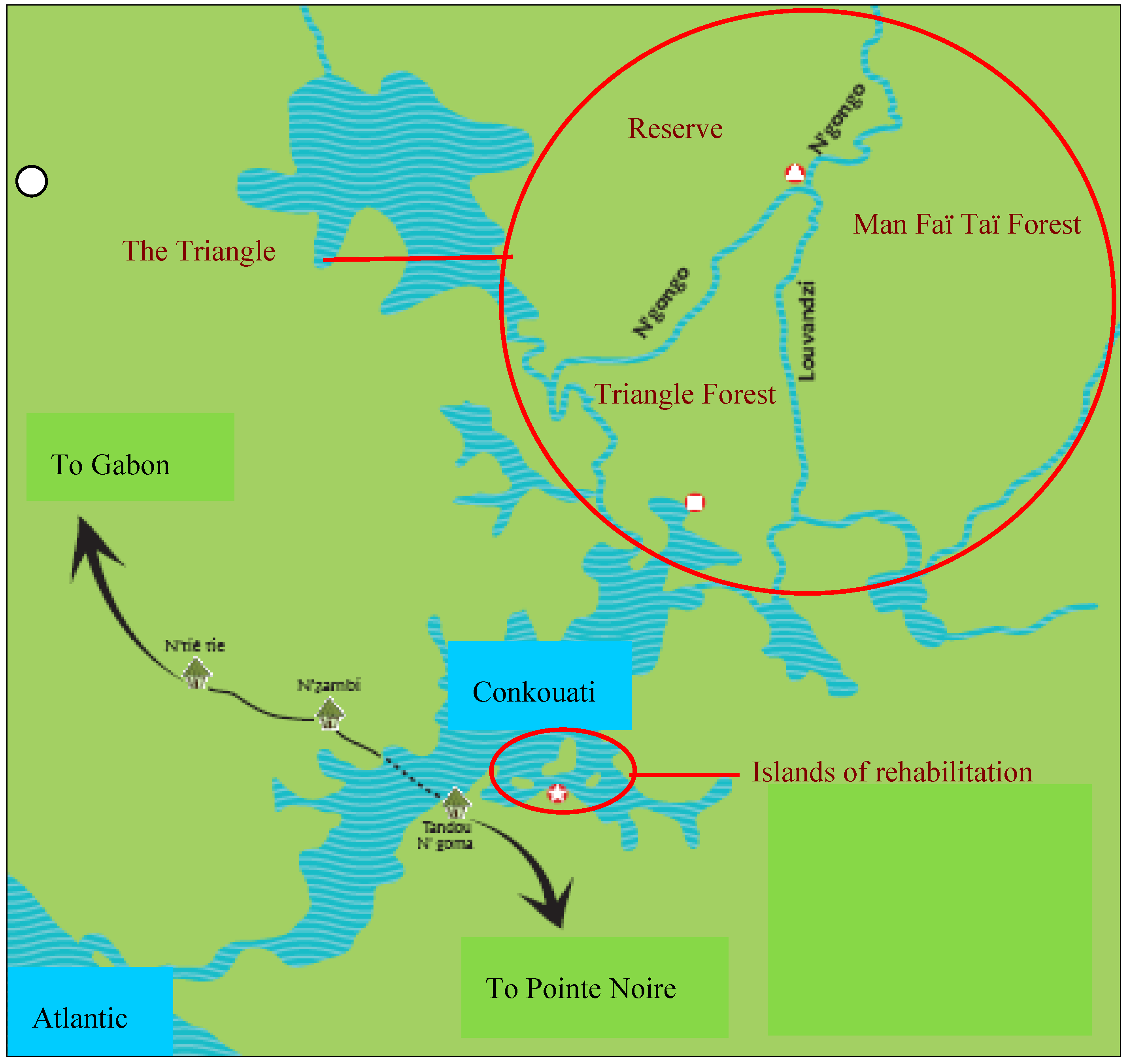 Six hundred species of plants have been identified, including around 100 species known to be eaten by wild chimpanzees [20]. The “Triangle” is surrounded by two rivers, but is not fully isolated as natural bridges occur, which allow the released chimpanzees to travel freely and to have access to two other areas of the Conkouati-Douli National Park: the Man Fai Tai forest and the Reserve (Figure 1).