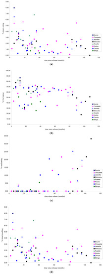 Our study does show that, when the same months are compared across years, fruit consumption decreased over time. One reason for the change in diet over time may be that during the captive period and early pre-release state (spent in semi-liberty on islands), the animals were mainly being fed with fruits (e.g., banana, papaya, figs) and therefore may have preferentially chosen to feed on fruit soon after release [12,20]. The decline in fruit eating is most probably because, in later years, the dietary repertoire expanded to include a greater range of food types, in particular seeds, as is found in wild chimpanzees [33,34,35,36,37].