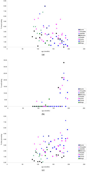 Significant relationships with age and (a) % insect eating; (b) % seed eating; (c) % time grooming. Each individual is represented as a separate symbol. Females are shown as triangles and males as squares.