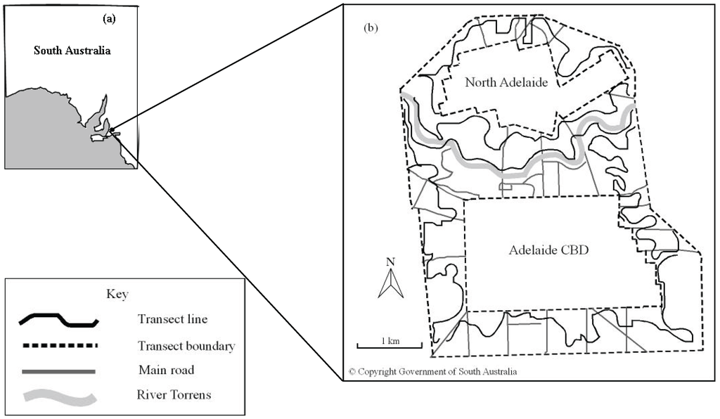 (a) Map of South Australia indicating Adelaide City []. (b) Bird survey transects in the Adelaide City parklands [].