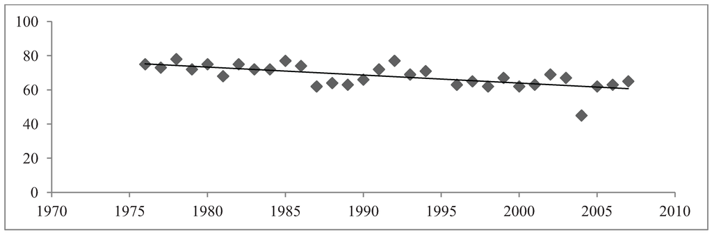 The avian assemblage declined over the 32 year period and, especially declined in years 2005 to 2007 (Figure 2). The measure of species richness was used as a diversity index in order to outline the long-term changes in species richness of Adelaide parkland birds. In the Adelaide City parklands from the years 1976 to 2007 the diversity of avifaunal species richness fluctuated from 45 species to 78 species (Figure 2). The mean species richness of birds was 68 (±1.209) species. 1978 saw the highest species richness with 78 species present in the parklands (Figure 2). The lowest measure of species richness was recorded in 2004 revealing only 45 recorded species. Linear regression analysis indicated a highly significant, negative relationship between species richness and the 32-year study period (R2 = 0.439, Sig. ≤ 0.001). Overall the species richness of birds recorded in the Adelaide City parklands shared a highly significant, strong, negative relationship with the 32-year time period.