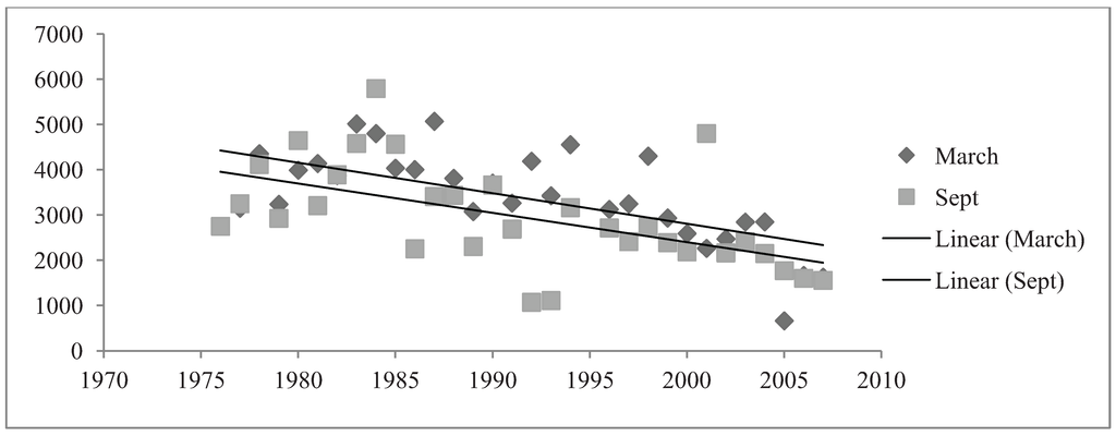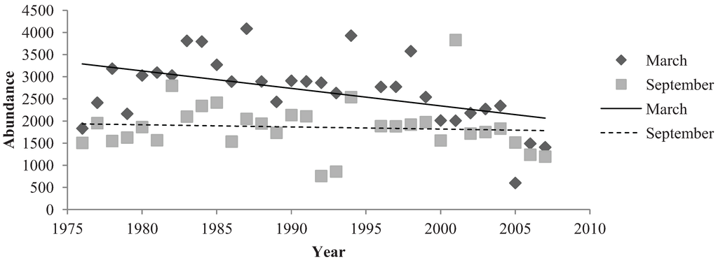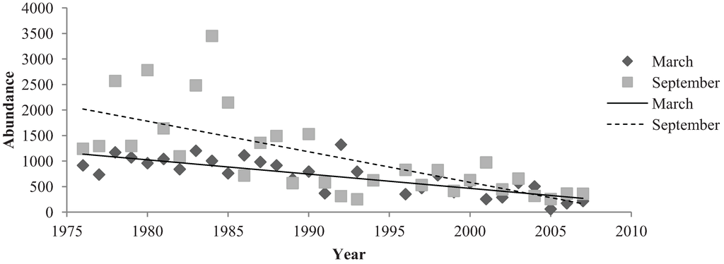 Abundance data were examined by comparing the number of birds recorded in March and September from 1976 to 2007 (Figure 3). In both March and September the resident species comprised a large majority of bird abundance (Figure 3). Overall, March and September months were similar in mean abundance calculations (Figure 3).