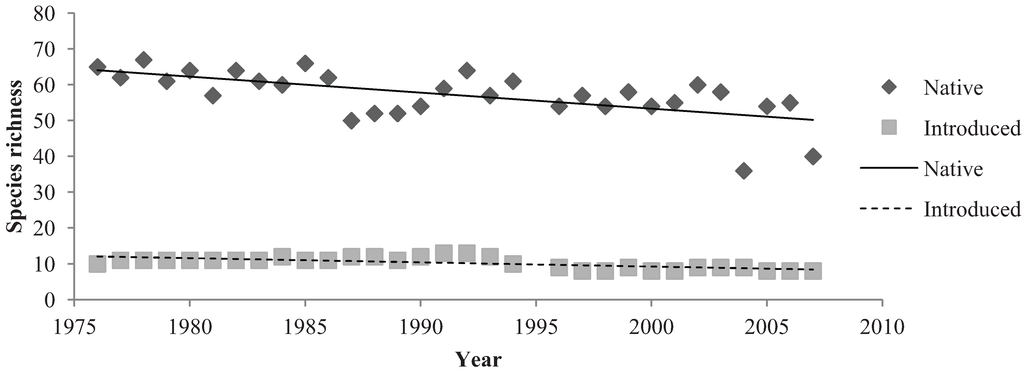 Linear regression analysis was performed on species richness data of native and introduced birds to determine long-term changes in native and introduced assemblages (Figure 4, Figure 5 and Figure 6). Native birds exhibited many small changes in species richness throughout the 32-year period (Figure 4 and Figure 5). Linear regression analysis indicated that native bird species in the parklands demonstrated a significant, negative relationship with the 32-year study period (R2 = 0.304, Sig. = 0.001). The R2 value indicated that this relationship was moderately strong. Linear regression analysis indicated a significant, negative relationship between introduced species in the parklands and the 32-year monitoring period (R2 = 0.471, Sig ≤ 0.001). The R2 value signified that this was a relatively strong relationship (Figure 4 and Figure 6).