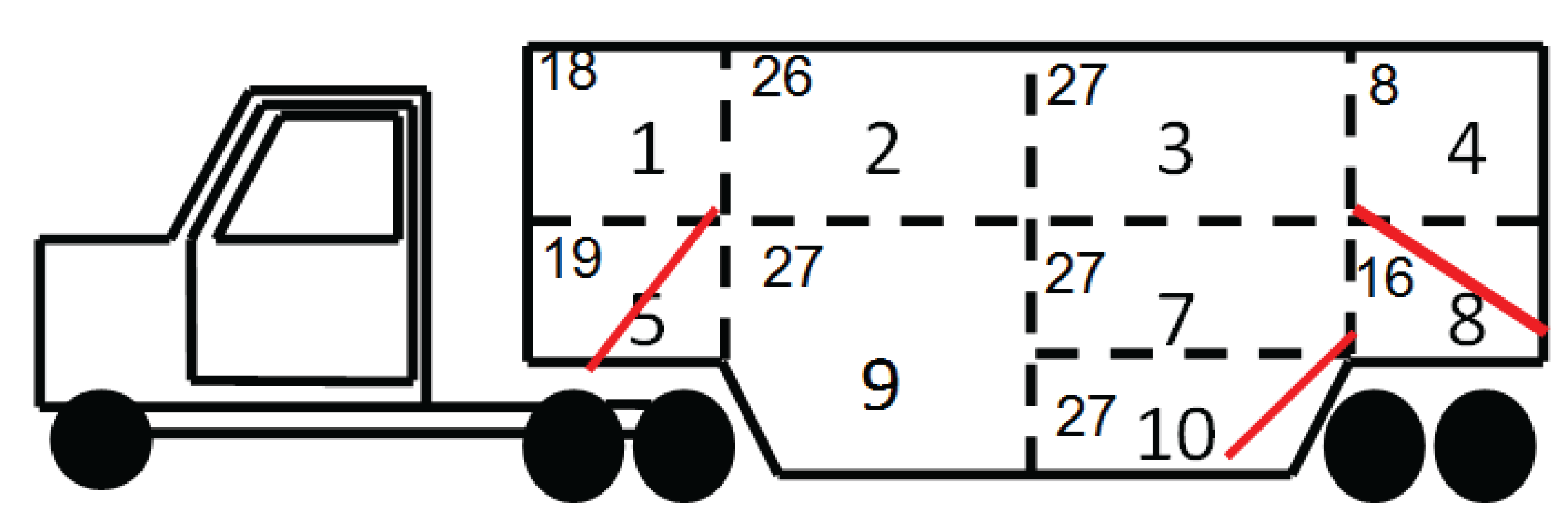 The location of compartments and distribution of pigs by compartment in the pot-belly trailer. Internal ramps are solid lines in compartments 5, 8, and 10.
