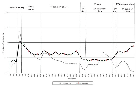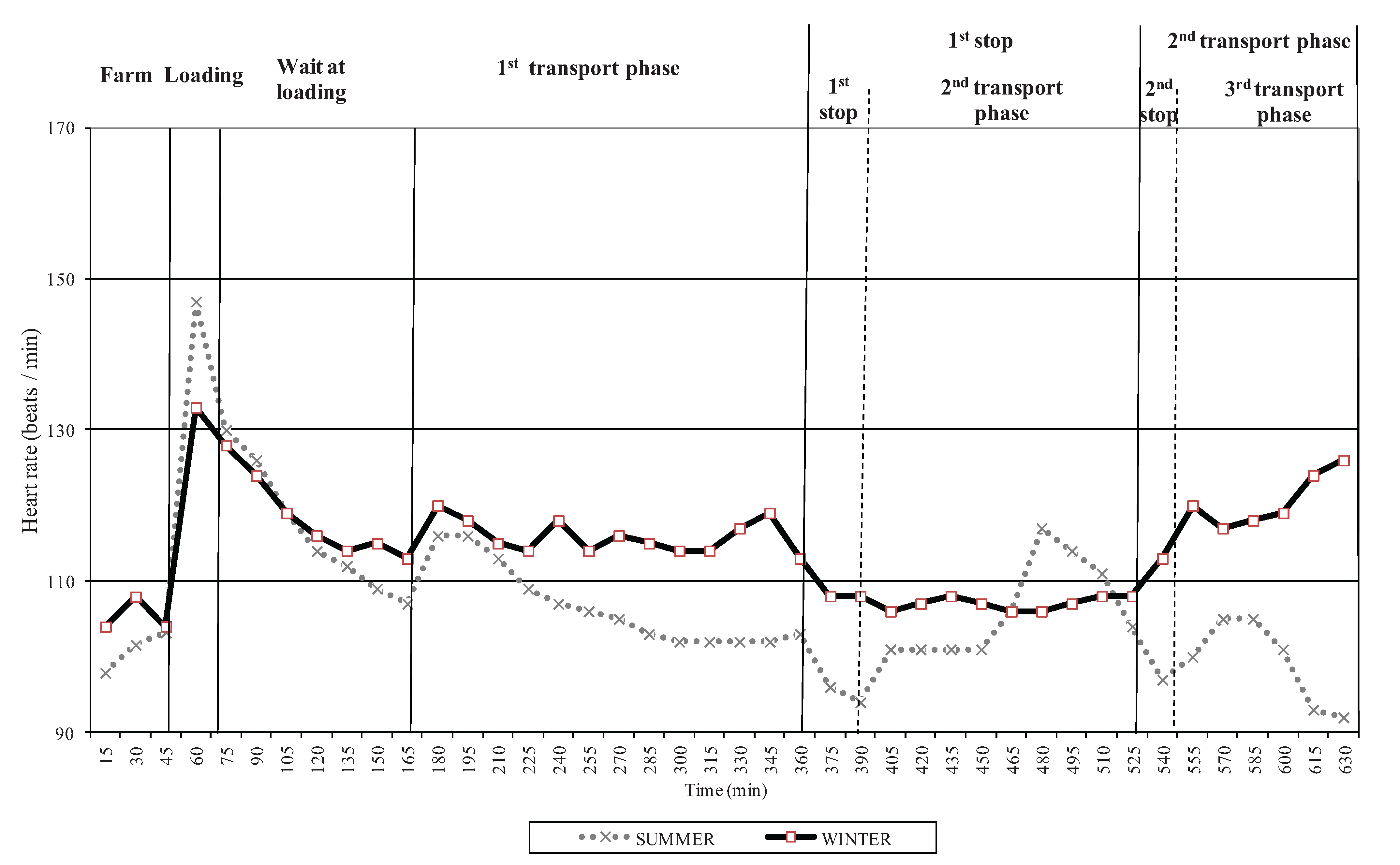 Heart rate from loading at the farm to 8 h transit time of pigs transported in a pot belly trailer in summer (six journeys) and winter (five journeys).