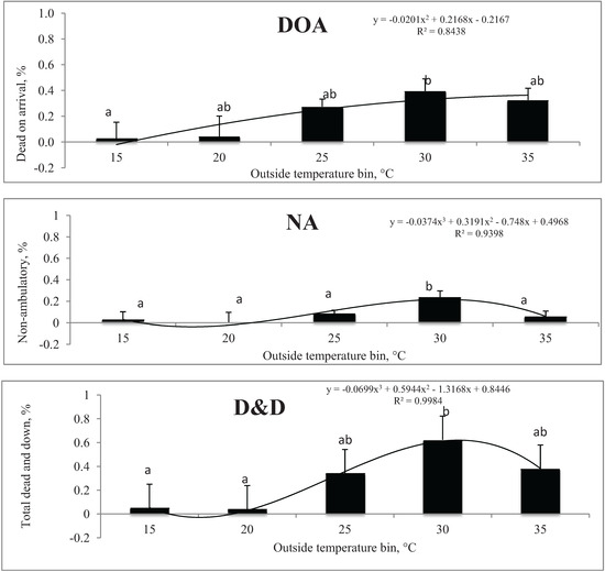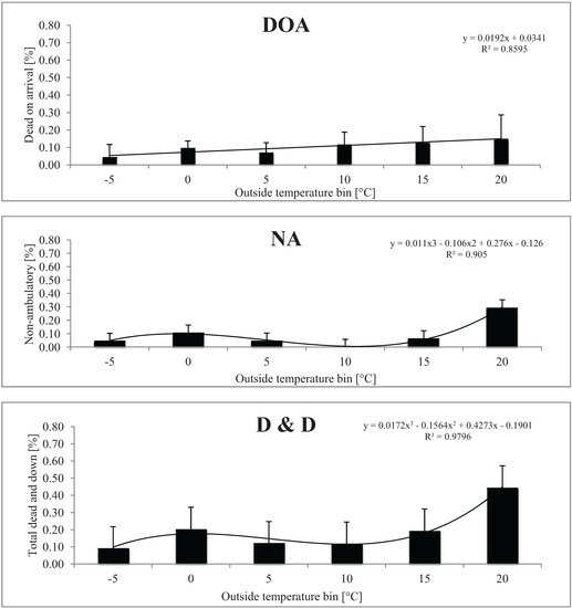 The percentage of DOA, NA, and D&D pigs in relation to outside temperature bins in cold weather is presented in Figure 1.