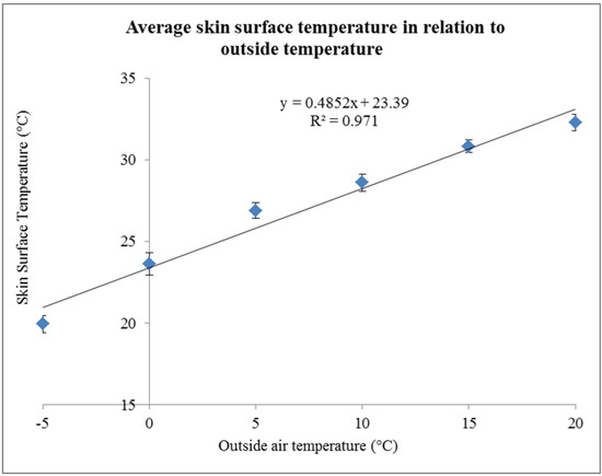 Skin surface temperature of pigs in relation to outside air temperature when unloaded at the processing plant. Total number of loads for each temperature bin is given in parentheses: −5 °C (14), 0 °C (14), 5 °C (31) 10 °C (25), 15 °C (70), 20 °C (39), and 25 °C (86). A total of 335 loads with 56,106 pigs were used for this analysis.