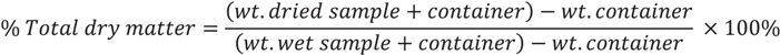 Bedding samples were collected for moisture percentage analysis after pigs had been unloaded. Researchers collected 1 sample of at least 100 g of bedding from the center of each deck, ensuring that the entire thickness of the bedding was represented. Samples were stored in resealable zipper storage bags, which in turn were sealed into larger resealable zipper storage bags, so as to prevent moisture loss. The samples were not frozen until the end of the week due to lack of freezer space at the plant; therefore, the time from collection to freezing varied from 1 to 5 days. Samples were stored at −80 °C until analyzed. Moisture percentage was estimated by drying 3 to 4 g of bedding in an aluminum cup at 100 °C for 24 h and calculating the percentage loss of moisture as shown [10]: