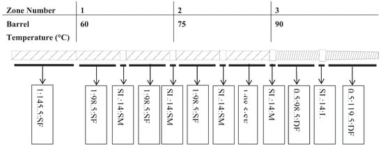 Diets were processed on a single screw extruder (X-20, Wenger Manufacturing, Sabetha, KS, USA) with the screw profile displayed in Figure 1. Processing conditions, e.g., extruder screw RPM (350 425 RPM as Medium, and 500 RPM) and preconditioner steam input (8 kg/h, 12 kg/h, and 16 kg/h as High) were varied to achieve different thermal to mechanical ratios. The specific ratios used were 500 RPM and 8 kg/h steam input for Low thermal to mechanical energy ratio, 425 RPM and 12 kg/h steam input for Medium, and 350 RPM and 16 kg/h steam input for High thermal to mechanical energy ratios.