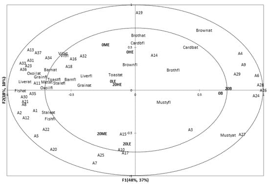Baked samples (0B and 20B) were associated with volatiles methyl butyrate (A24), methyl octanoate (A26), methylpyrazine (A28), 3-furaldehyde (A6), and 2,5-dimethyl pyrazine (A29). Methylpyrazine may have popcorn-like, 2,5-dimethyl pyrazine roasted odors, 3-furaldehyde bread-like odors, and esters fruity odors [29]. The concentrations of these volatiles were small, grainy, and toasted, and brown flavor attributes were lower in intensity in baked than in extruded samples. This may address why the extruded samples were more related to these sensory characteristics. Similar associations were found among samples 20ME and 20LE and volatiles 2-octenal (A15), 2-heptenal(Z) (A10), 2-nonenal (A17), 2-hexenal(E) (A7), and methyl hexanoate (A25).