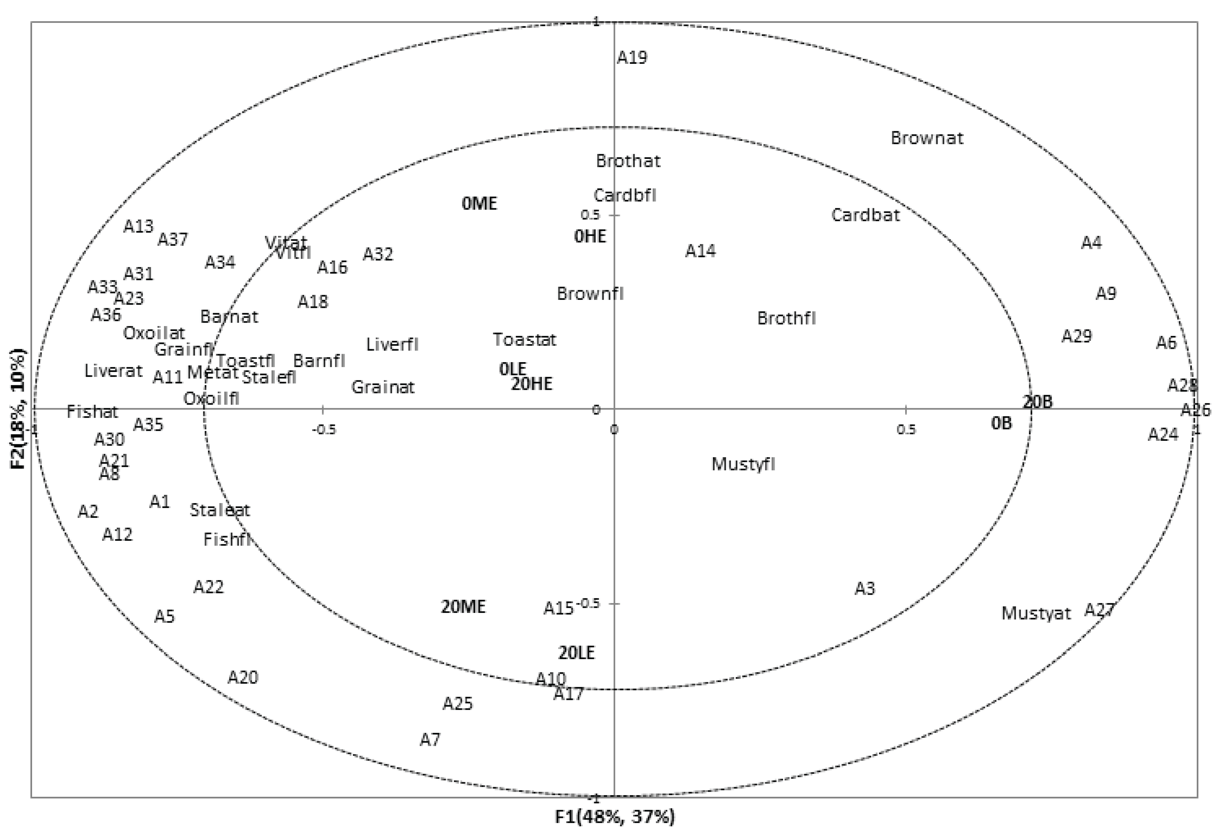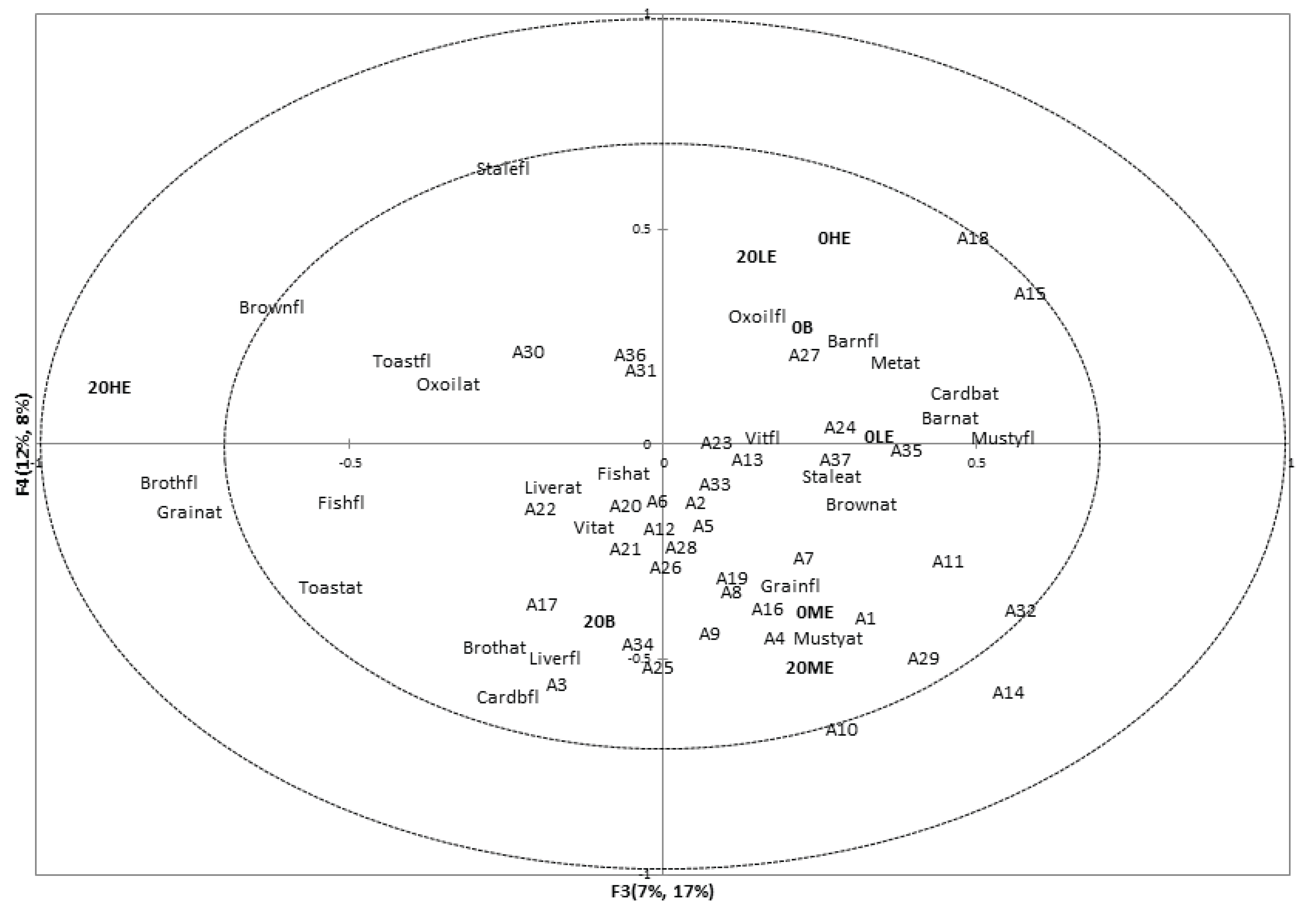 Some associations were found among sensory flavor and aftertaste attributes and volatile compounds. Vitamin flavor (Vitfl) and vitamin aftertaste (Vitat) seemed to be related to limonene (A34), 4-methyl pentanoic acid (A32), and nonanal (A16). In addition associations were found among the attributes toasted (Toastfl), grain (Grainfl), stale (Stalefl), and oxidized oil flavor (Oxoilfl), oxidized oil (Oxoilat), metallic (Metat), liver (Liverat), fish (Fishat), and barnyard (Barnat) aftertaste, and volatiles 3-dodecene (A35, tentative identification), 2-butylfuran (A30), benzaldehyde (A11), 3-hydroxytoluene (A36), 2-nonanone (A23), 1-R-α-pinene (A33, tentative identification), and 2-pentylfuran (A31). Furthermore, stale aftertaste (Staleat) and fish flavor (Fishfl) were associated with volatiles hexanal (A5), 3-octen-2-one (A22), octen-3-ol (A1), 2-decen-1-ol (A2), and octanal (A12). This cluster of volatiles and sensory attributes are likely to indicate oxidation processes and rancid aromatics. Similar associations were found by Koppel et al. [13].