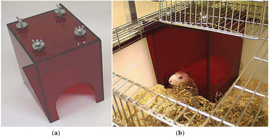 This nest box is designed for rats with external devices. (a) The box has a wide entrance and is bolted to the cage lid so that the animal cannot move it. The corners are extended to meet the side of the cage at the front left and back right of the box to prevent animals from squeezing between the box and cage walls. (b) The adapted box in situ.