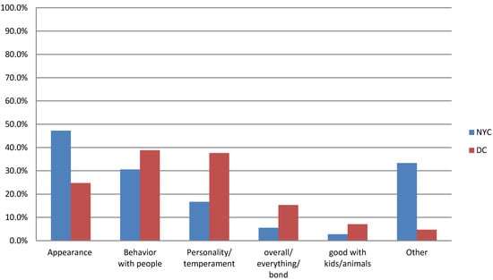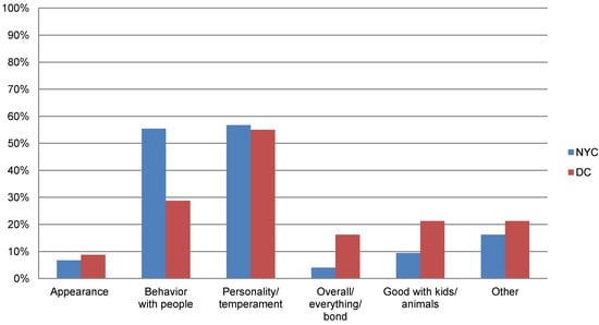 Categories were also created for responses to open-ended questions. For example, responses to two questions, one asking about characteristics that led them to select their dog and the other asking what they originally liked best about the dog, were categorized into the same 4 categories as follows: appearance included responses about how the dog looked (e.g., color, cuteness, big eyes, size). The behavior with people category included responses that described how the dog interacted with people (e.g., came to me, friendly, loving), while the personality/temperament included answers, such as “well-behaved, trained, energetic or mellow”. The final other category included all other answers, such as “only one left,” “dog reminded owner of himself” or “help out a friend”.