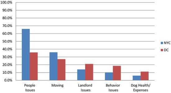 Answers to multiple-choice questions with an open-ended “other” category (to which respondents could add a response not listed among the other choices) were either incorporated into one of the given choices (where appropriate) or made into a new category. For example, responses of “family” to the question asking about where respondents had obtained their dog were combined with the “friend” responses into a friend/family category. Similarly, for yes/no questions with an option “if yes, please describe”, similar answers were grouped and given a category. For example, people answering yes to whether they had reservations when first acquiring their dog were asked to describe their reservations. Their reservations were grouped into three categories for summary and analysis: (1) housing-related (e.g., my building did not allow big dogs, worried about housing rules); (2) dog-related (e.g., concerned about the dog’s temperament); and (3) people-related (e.g., concerned that another person would not want the dog). Similarly, for people answering yes to whether something had changed in the household that contributed to the relinquishment, responses were summarized in five categories: people issues, moving, landlord issues, behavior issues and dog health/expenses. The people issues category included overall financial, people health, child-related and lack of time issues. Having to move or already moved were combined into the moving category, and landlord issues included responses, such as “the landlord found out about the dog”, “the landlord decided to start enforcing the no dog rule” or “the housing rules changed”. The behavior issues category included responses, such as those relating to housetraining, aggression or chewing. The dog health/expenses category included the inability to pay for veterinary care, pet food or to just care for the dog.