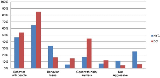As shown in Table 2, the age and gender distributions of relinquished dogs were not significantly different. The majority of respondents had only the surrendered dog in the household and about a quarter had one other dog (26% NYC, 25% DC). One household in NYC reported that they had three other dogs.