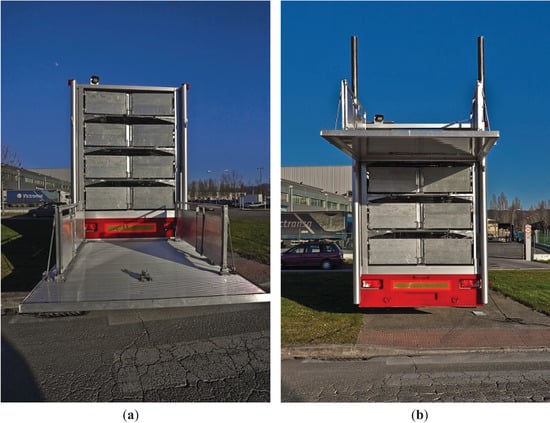 In the majority of swine production systems in the U.S., piglets are farrowed at sow farms and transported to grower-finisher sites at weaning. When the piglets are to be transported, they are handled and moved from their home pens, walked along an aisle, then loaded into the trailer. Trailers used to transport these piglets are usually pot-bellied or straight-deck designs []. Metal, wooden or concrete ramps of various angles are commonly used to load the piglets from the aisle to the trailer. Additionally, more ramps may be used within the trailer to move piglets from one deck to another. Trailers in the European Union (EU) may be equipped with hydraulic lifts to move pigs to the desired deck of the trailer, preventing the pigs from having to walk up a sloped ramp [].