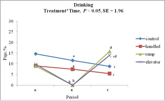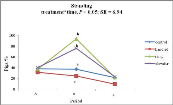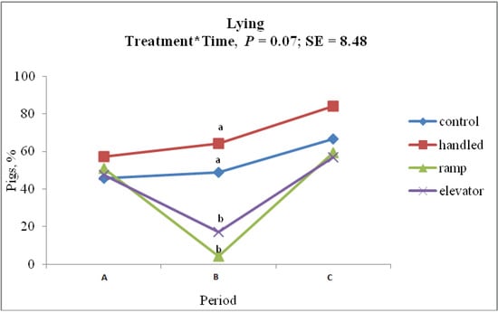 The behavior of pigs can vary before, during and after a stressful event. In addition, physiological measures, such as temperature, respiratory rate, heart rate, blood parameters and immune measures, are affected by stress [,]. Sitting, standing, lying, feeding and drinking behaviors before, during and after piglets were loaded into the trailer either using a ramp or elevator were compared with control and handled piglets. The number of piglets showing standing behavior inside the trailer did not differ between ELE and RAM piglets, but these numbers were greater than the numbers of CON and HAN piglets showing standing behavior at this time point. This shows that piglets were more restless in the trailer, which may be due to the novelty and stress of being moved. Feeding and drinking behavior were null when the piglets were in the trailer, because feed and water were unavailable in the trailer.