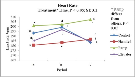 The heart rate of ELE pigs decreased after the pigs were brought back to the home pen; on the other hand, the heart rate of RAM pigs remained elevated. The heart rates of RAM and ELE piglets did not differ during treatment. The heart rate is considered an indicator of stress, and it may have been elevated in these treatment groups, due to the novelty of the experiences. An analysis of cortisol concentrations is warranted in future studies to support other physiological changes indicative of stress. Brown [] reported a lowered heart rate, but an elevated cortisol concentration when a modular system was used to load and unload pigs, showing that pigs might still be stressed even though the heart rate is not elevated. They also reported little difference between ramp and elevator use, which is inconsistent with the findings of this study.