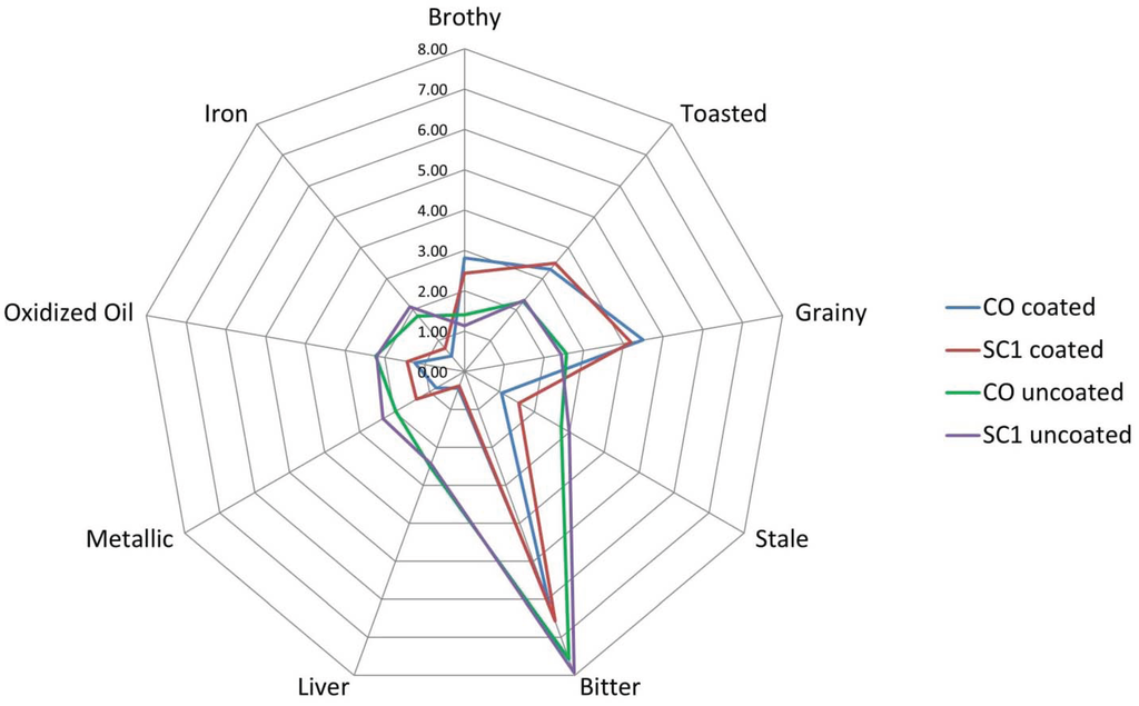 Off-notes oxidized oil and dusty/earthy were significantly different for aroma and flavor among the uncoated treatments. Samples GF6 and GF12 showed the highest oxidized oil aroma and flavor level. Stale, egg, and bitter were significantly different in flavor. Samples GF12 and SC2 were the most bitter while GF3 was the least bitter sample. The samples varied in barnyard, stale, bitter, sweet, oxidized oil, fish, and iron aftertaste. Sample GF12 had the highest bitter aftertaste and was the highest in stale, barnyard, sweet, oxidized oil, and fish aftertaste.