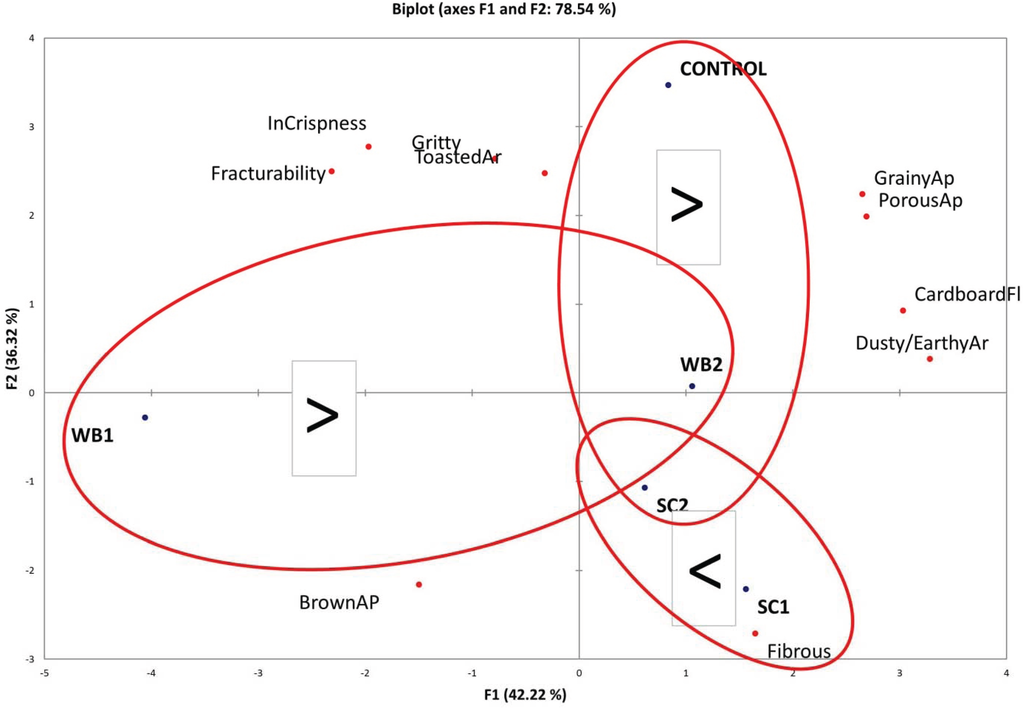 A Principal Components Analysis (PCA) was conducted in order to visualize the main differences between the treatments and to relate these to dog preference testing results. A total of 78.54% of variability among the treatments was explained by the two first Principal Components (Figure 3). According to the PCA analysis in the comparison of treatments WB1 and WB2, porous appearance and cardboard flavor and dusty/earthy aromatics may have influenced palatability. The comparison between CO and WB2 or SC2 resulted in the CO treatment being more palatable. This may have been caused by higher toasted aromatics, grittiness, initial crispness, or fracturability. The comparison between SC1 and SC2 resulted in the SC1 treatment being more palatable. This may have been caused by the more fibrous texture of treatment SC1.