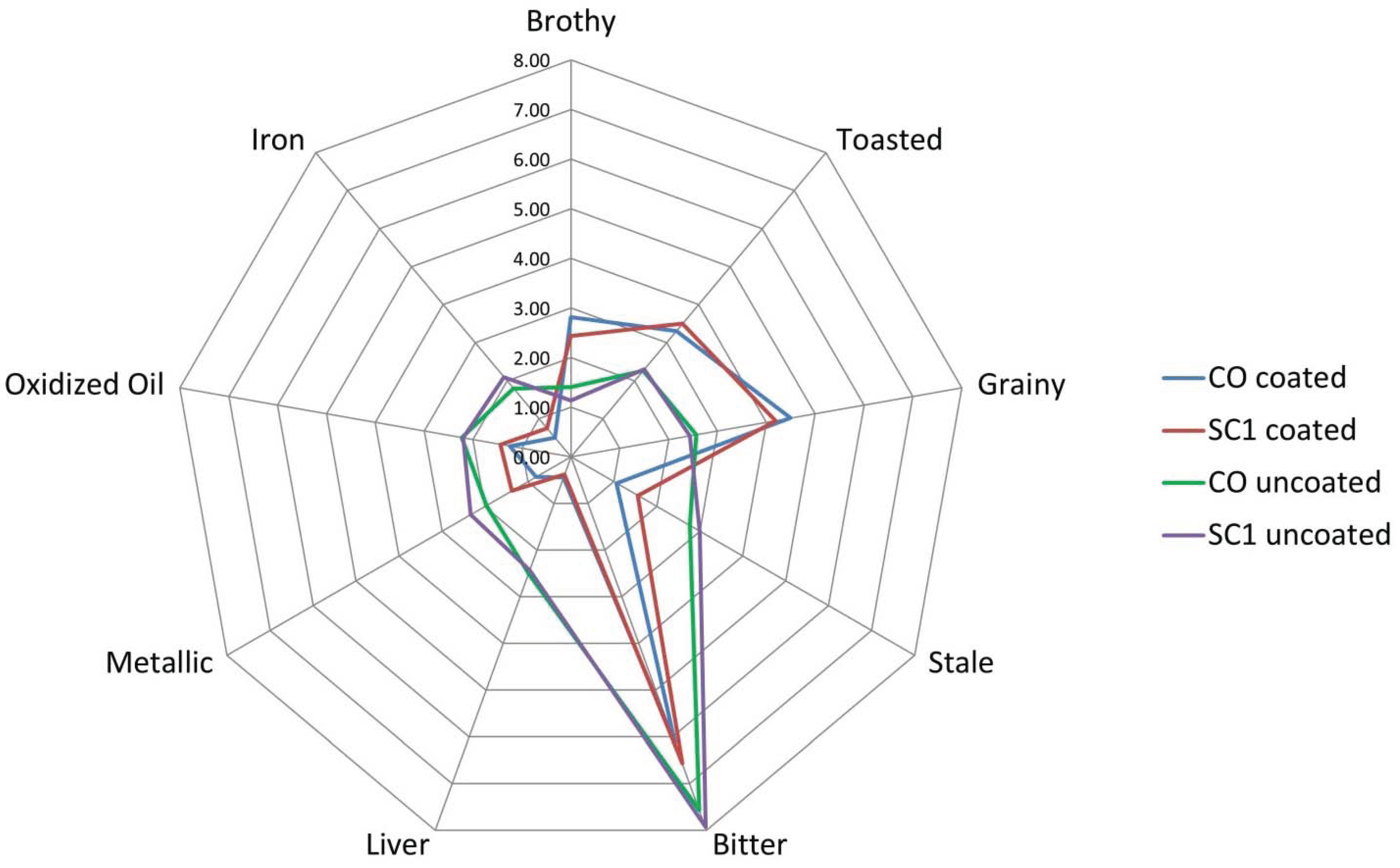 | Oxidized Oil Aroma | 2.13 ab | 1.87 b | 2.37 a | 2.37 a | 1.77 b | 2.00 ab | 1.83 b | 1.73 b |