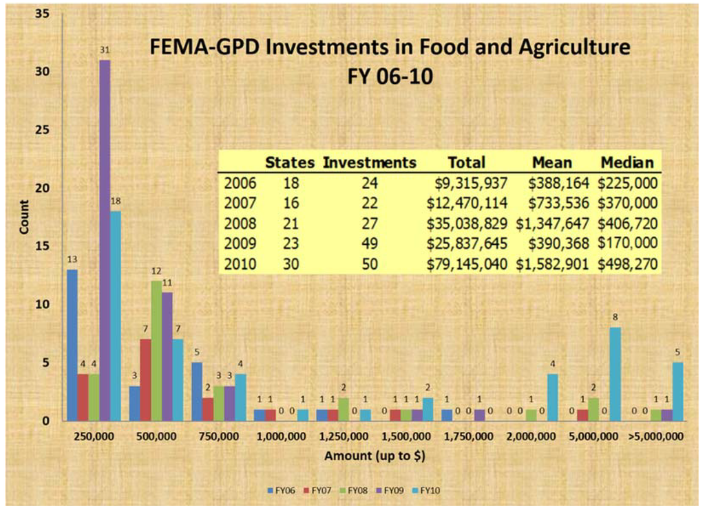 Summary of the number of States and projects funded to support disaster preparedness for animals and the approximate amount of funding per project (Fiscal Years 2006–2010); most projects supported animal agriculture. Source: FEMA, 2011.