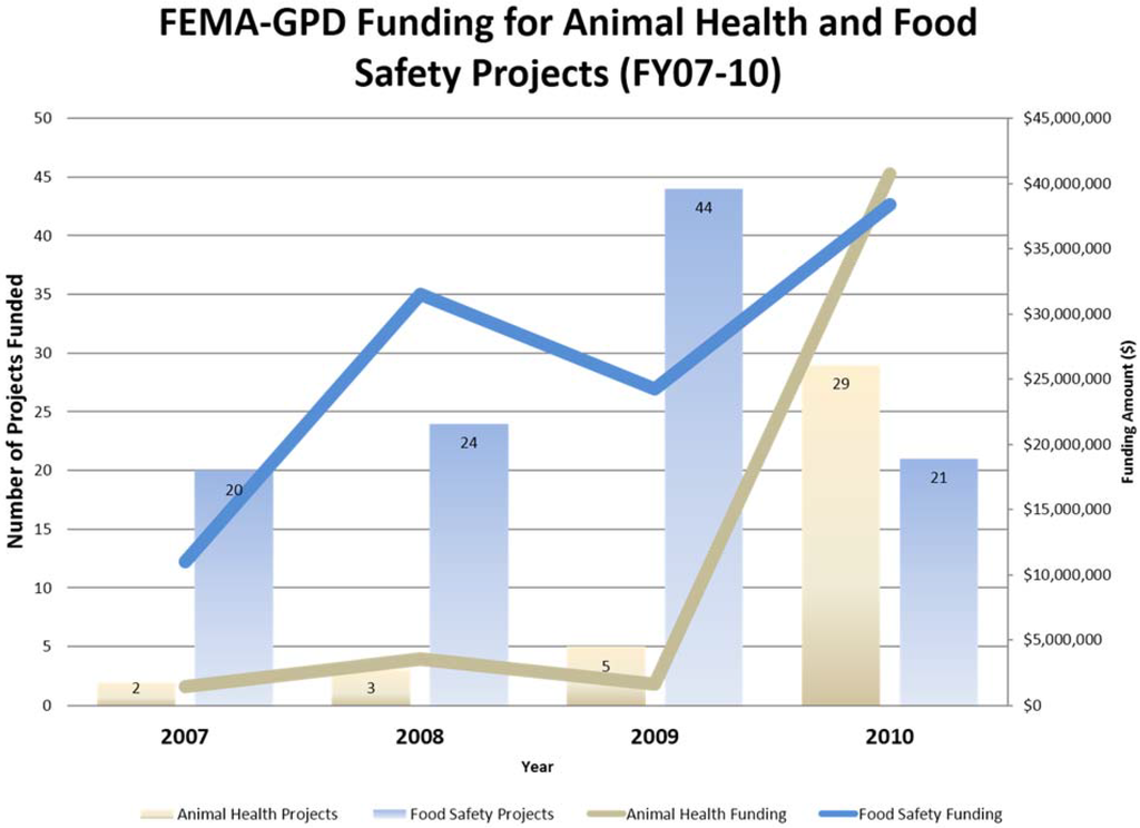 Summary of the total number of projects funded and funding obligated by FEMA to support disaster preparedness for animals (Fiscal Years 2007–2010); most projects supported animal agriculture. Source: FEMA, 2011.