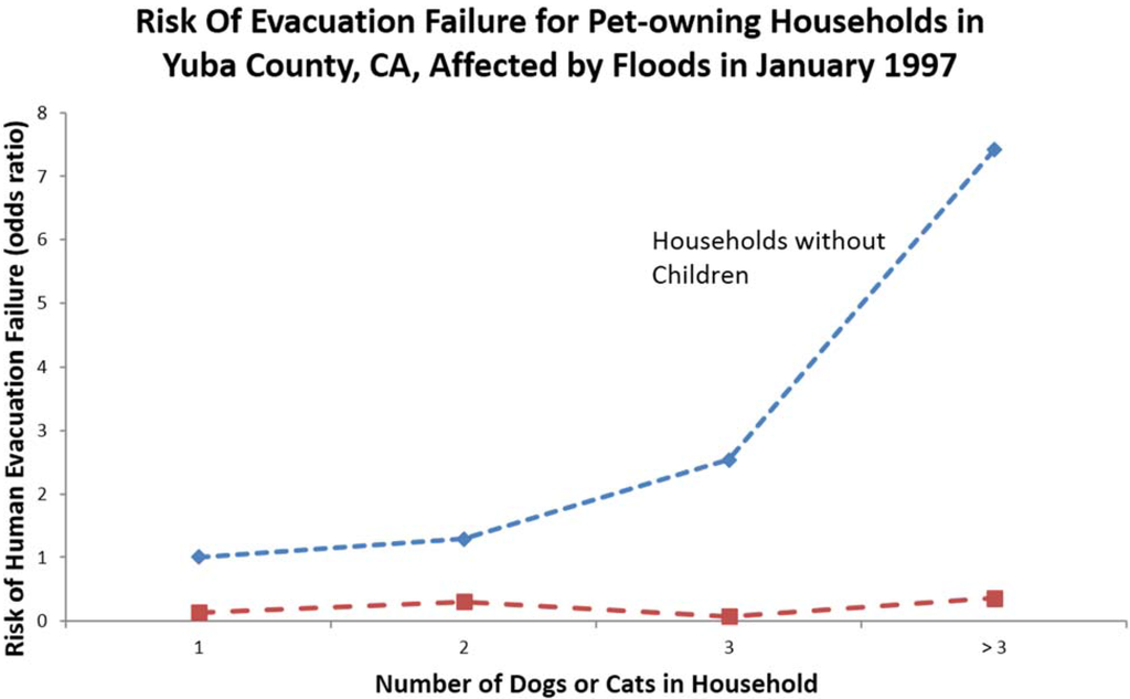 Pet ownership is the single most common factor associated with human evacuation failure that can be positively affected when the threat of disaster is imminent [21,22]. Based on multiple studies of actual evacuations, 20%–30% of all human evacuation failures can be attributed to pet ownership. Research has shown that this behavior is principally a phenomenon of households without children and is directly correlated with the number of pets in a household (Figure 3). Planning and preparedness activities are key to reducing this problem. Planning efforts should identify vulnerable pet owners and preparedness efforts should develop community-based approaches to help, such as buddy systems amongst neighbors. Emergency managers can also help reduce the number of people, who do not evacuate because of pets, by offering them free cardboard cat carriers and dog leashes as officials go door to door to announce the need to evacuate with pets. Although most evacuees are able to find a place to stay on their own, prior identification of a pet-friendly shelter where owners can find temporary shelter for themselves and housing for their pets provides further encouragement to pet owners to evacuate with their pet. Transportation supplies, such as carriers, collars, and leashes can be made available on demand through agreements between local emergency managers, pet accessory retailers and other suppliers.
