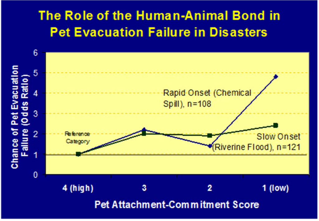 Chart showing an inverse correlation between the strength of pet owners’ bond with their pets and the likelihood that they will evacuate their pet in both slow and rapid onset disasters [28].
