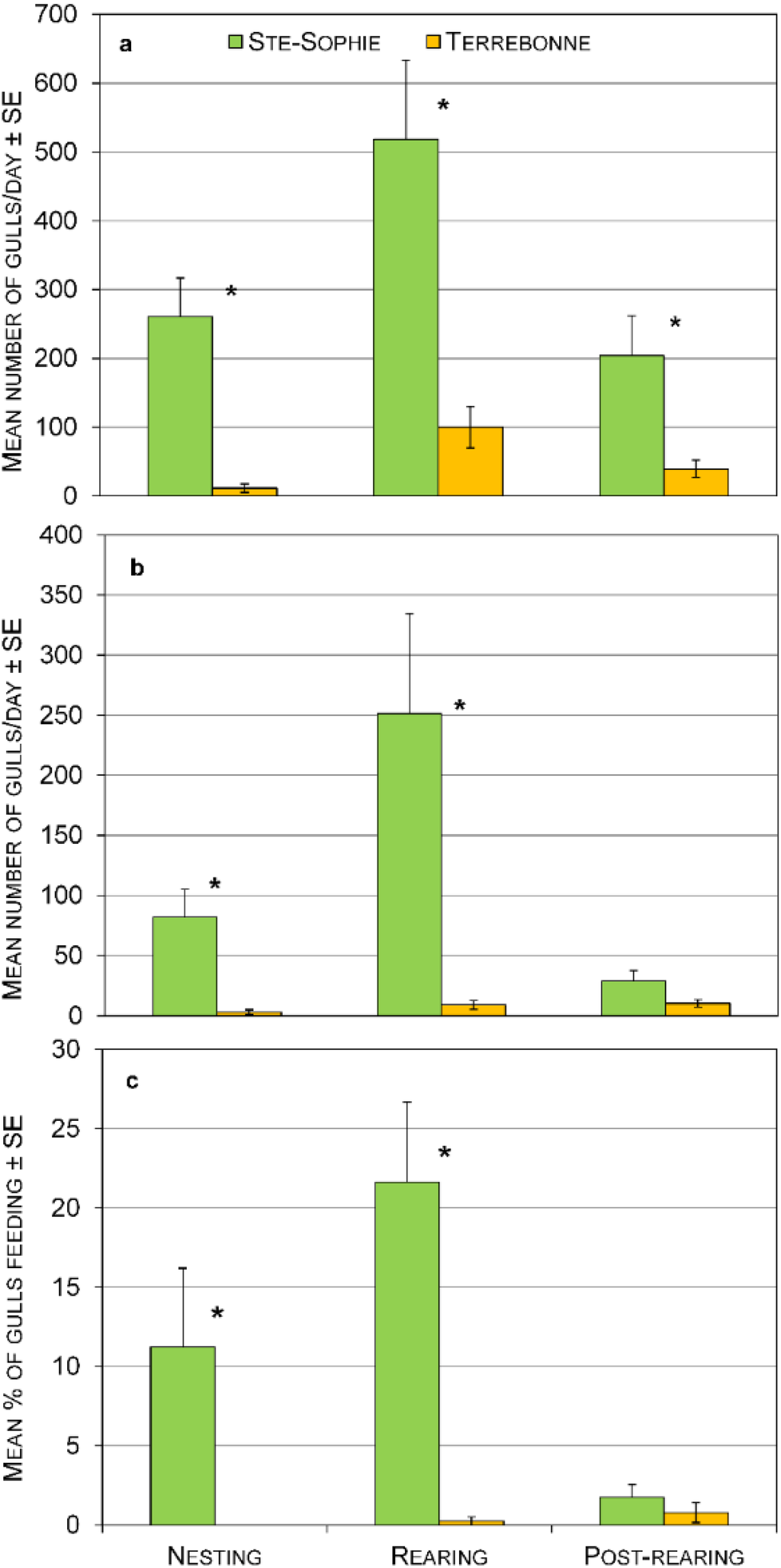 Use of the Terrebonne and Ste-Sophie landfills during the nesting, rearing, and post-rearing stages of ring-billed gulls breeding on Deslauriers Island, QC, 2010: (a) Mean ± SE number of gulls/day at each site; (b) Mean ± SE number of gulls/day at the tipping area at each site; (c) Mean ± SE percent of gulls feeding at each site. Asterisks represent significant differences between sites (p < 0.05).