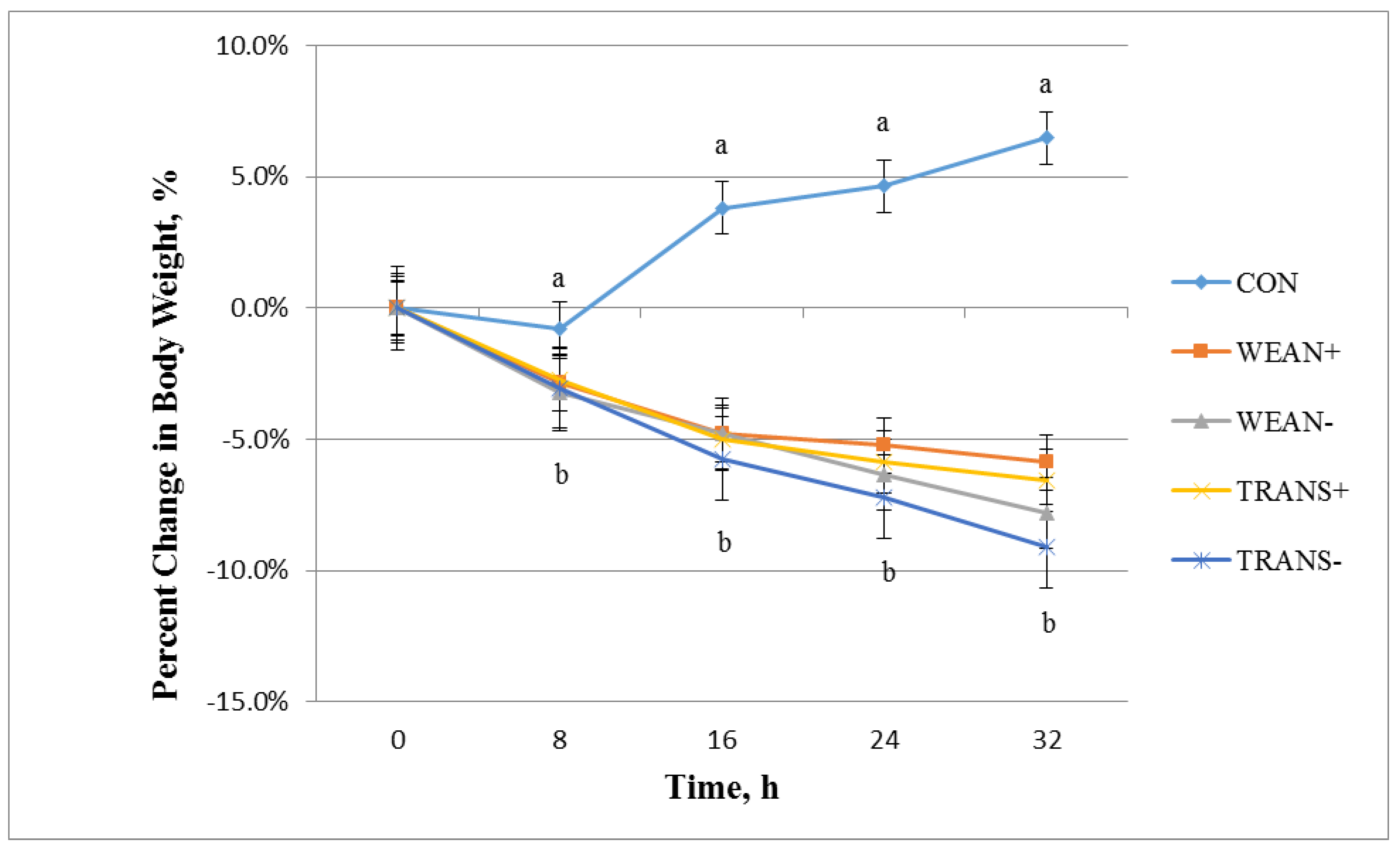 The treatment by time interaction was significant for percent change in body weights (p < 0.01). All treatments were different from the CON group at 8 h (Figure 1). TRANS− pigs differed in percent loss in body weight from WEAN+ and TRANS+ pigs at 24 h (p < 0.05), but did not differ from the WEAN− group. At 32 h, TRANS− pigs differed in percent loss in body weight from all treatment groups (p < 0.05). WEAN+ pigs had a similar loss in body weight as TRANS+ pigs, but differed from WEAN− and TRANS− pigs (p < 0.05). The additional loss in percent body weight recorded in TRANS− and WEAN− pigs was likely due to the lack of feed and water. These findings have also been documented in slaughter weight pigs that have been transported and fasted for 25 to 48 h [5,11,24,25,26,27,28,29,30,31].